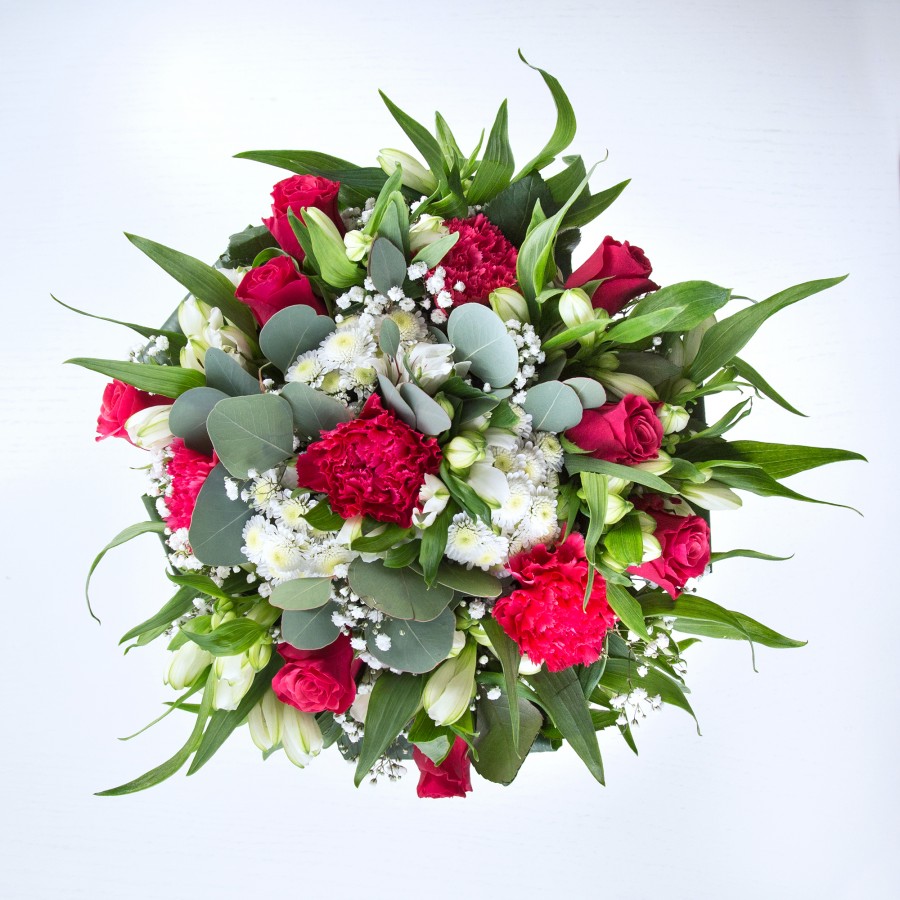 Celebrate life’s special moments with our majestic bouquet, expertly arranged to inspire awe and admiration. Featuring an alluring mix of impeccably fresh red roses, charming carnations, and ethereal mini white chrysanthemums, this bouquet is a tribute to natural beauty. Enhanced with the delicate touch of gypsophila, pristine white alstroemeria, and stylish aspidistra leaves, it offers an unmatched visual delight.